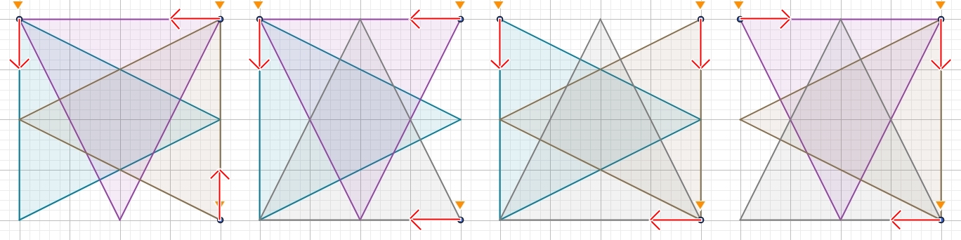 1가지 경우, 검이 꽂혔을 때 안전지대 후보가 4가지 생기며, 세 꼭짓점의 검의 이동방향에 따라 하나로 확정됩니다.